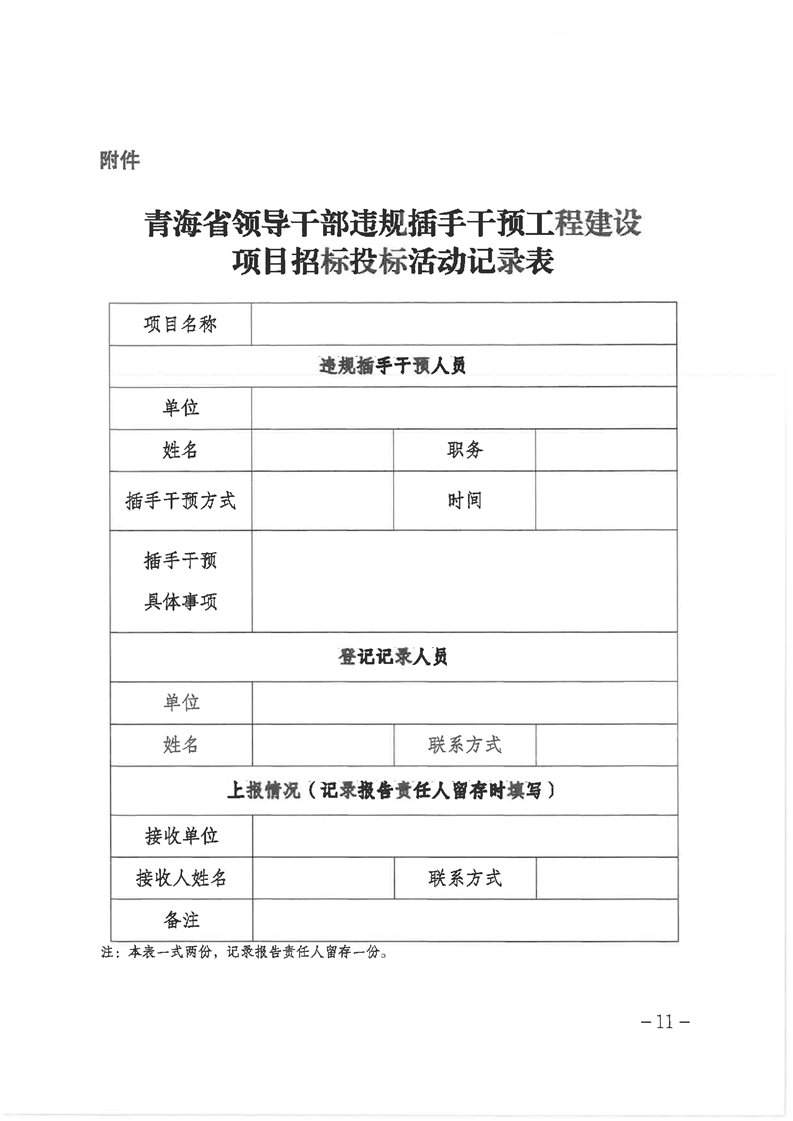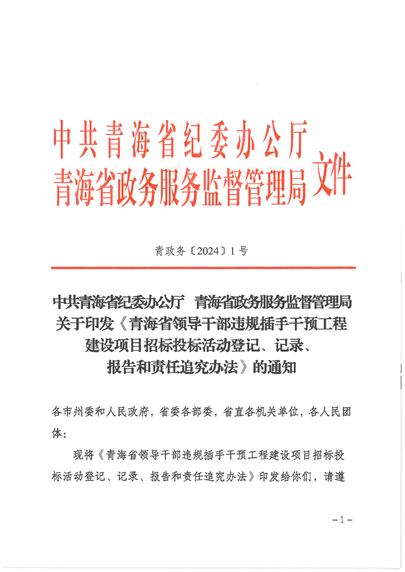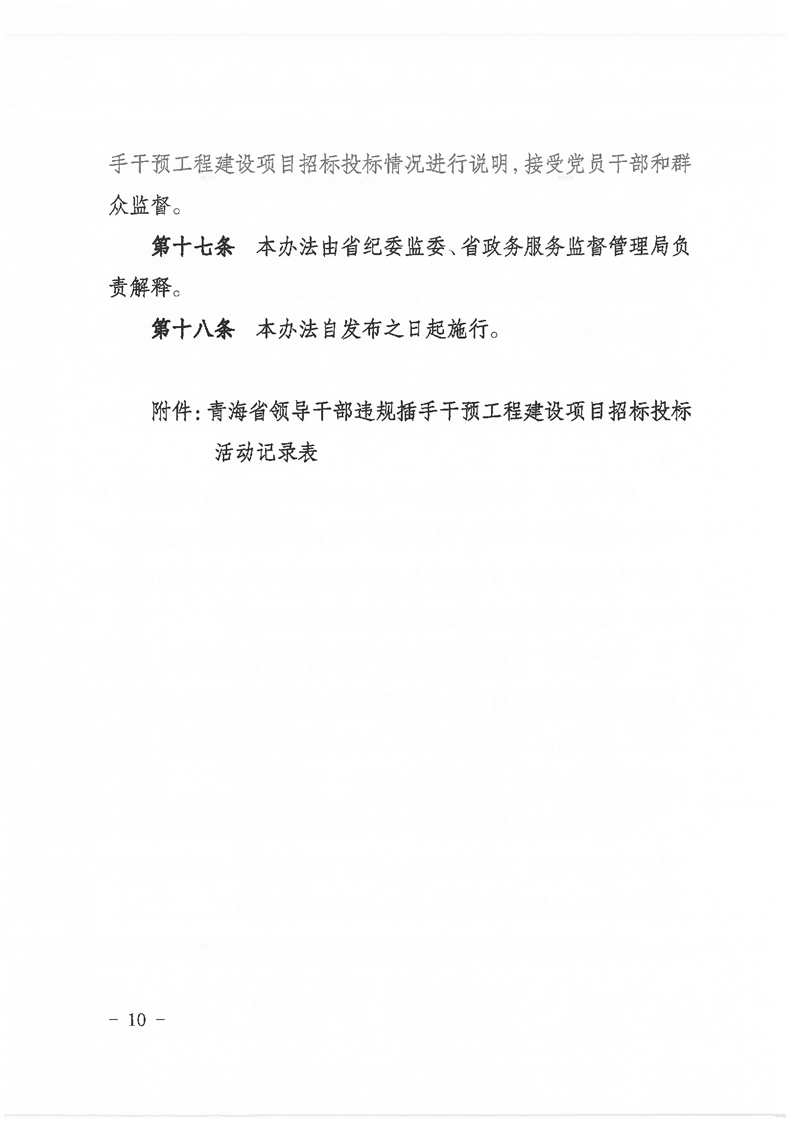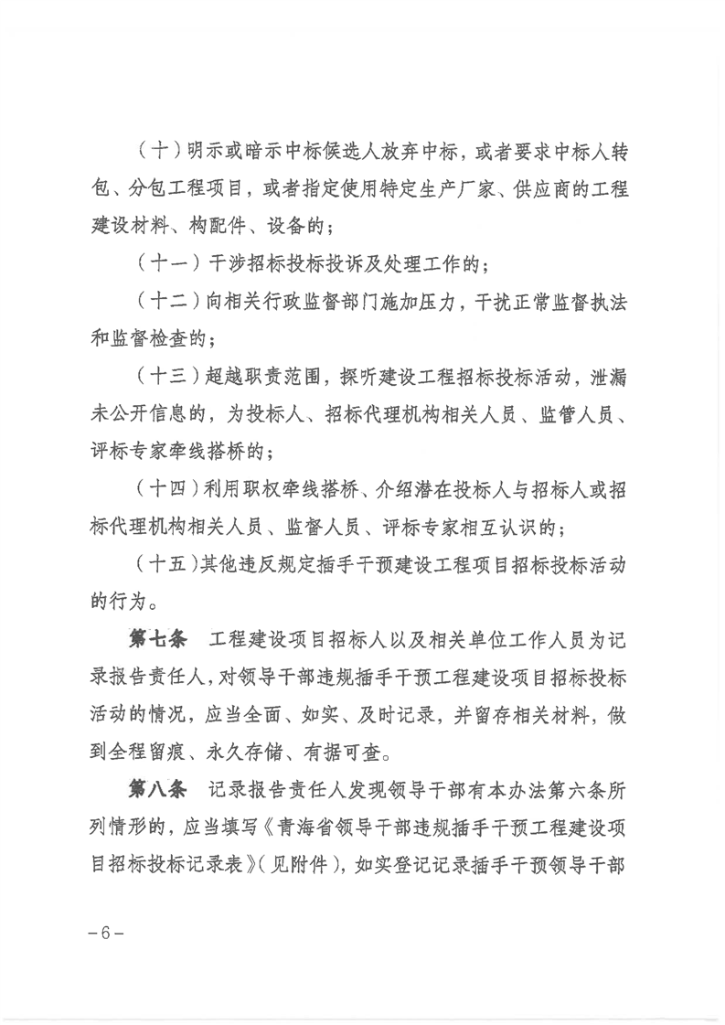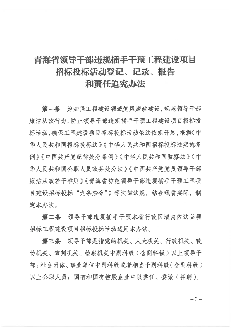 關(guān)于印發(fā)《青海省領(lǐng)導(dǎo)干部違規(guī)插手干預(yù)工程建設(shè)項目招標投標活動登記、記錄、報告和責任追究辦法》的通知