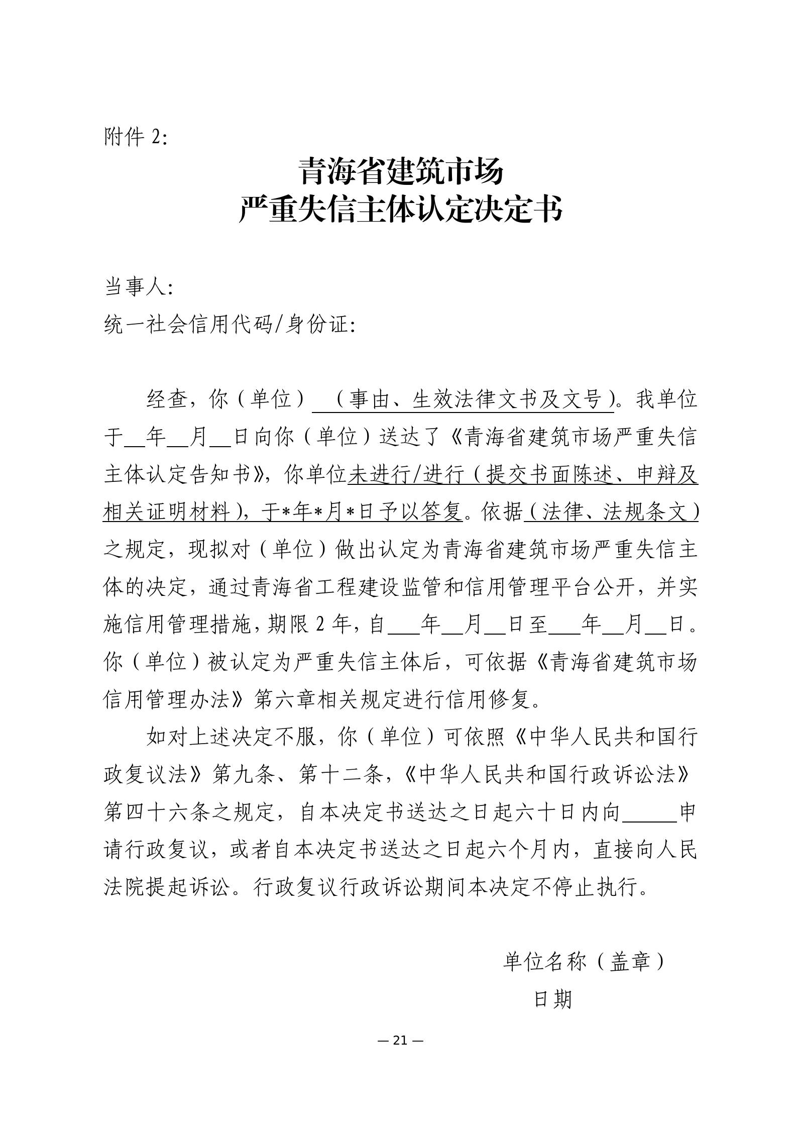 (四)住房和城鄉(xiāng)建設(shè)主管部門應(yīng)當(dāng)在決定作出后10個工作日內(nèi)向當(dāng)事人送達(dá)《青海省建筑市場嚴(yán)重失信主體認(rèn)定決定書》(附件2)。
