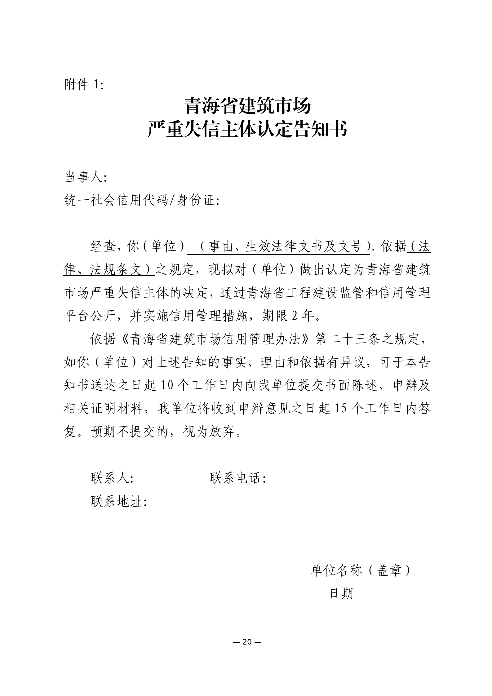 (一)經(jīng)發(fā)現(xiàn)存在建筑市場嚴(yán)重失信主體認(rèn)定標(biāo)準(zhǔn)的,應(yīng)當(dāng)向建筑市場主體送達(dá)《青海省建筑市場嚴(yán)重失信主體認(rèn)定告知書(附件1),告知書載明認(rèn)定的理由、依據(jù)、懲戒措施和建筑市場主體享有的陳述、申辯權(quán)利。