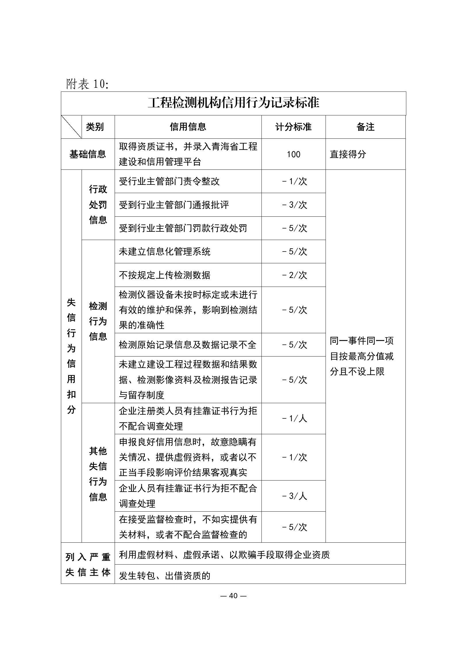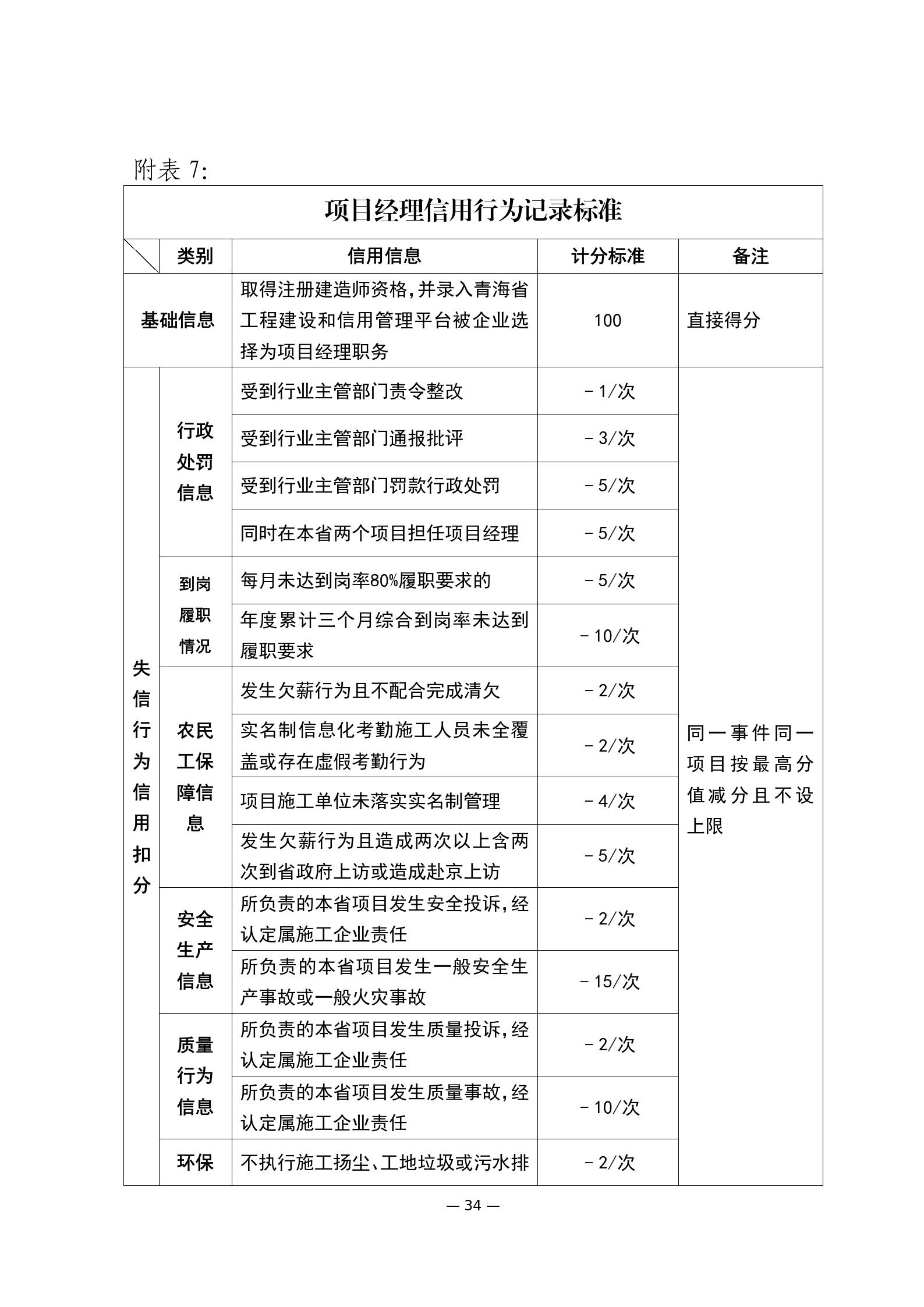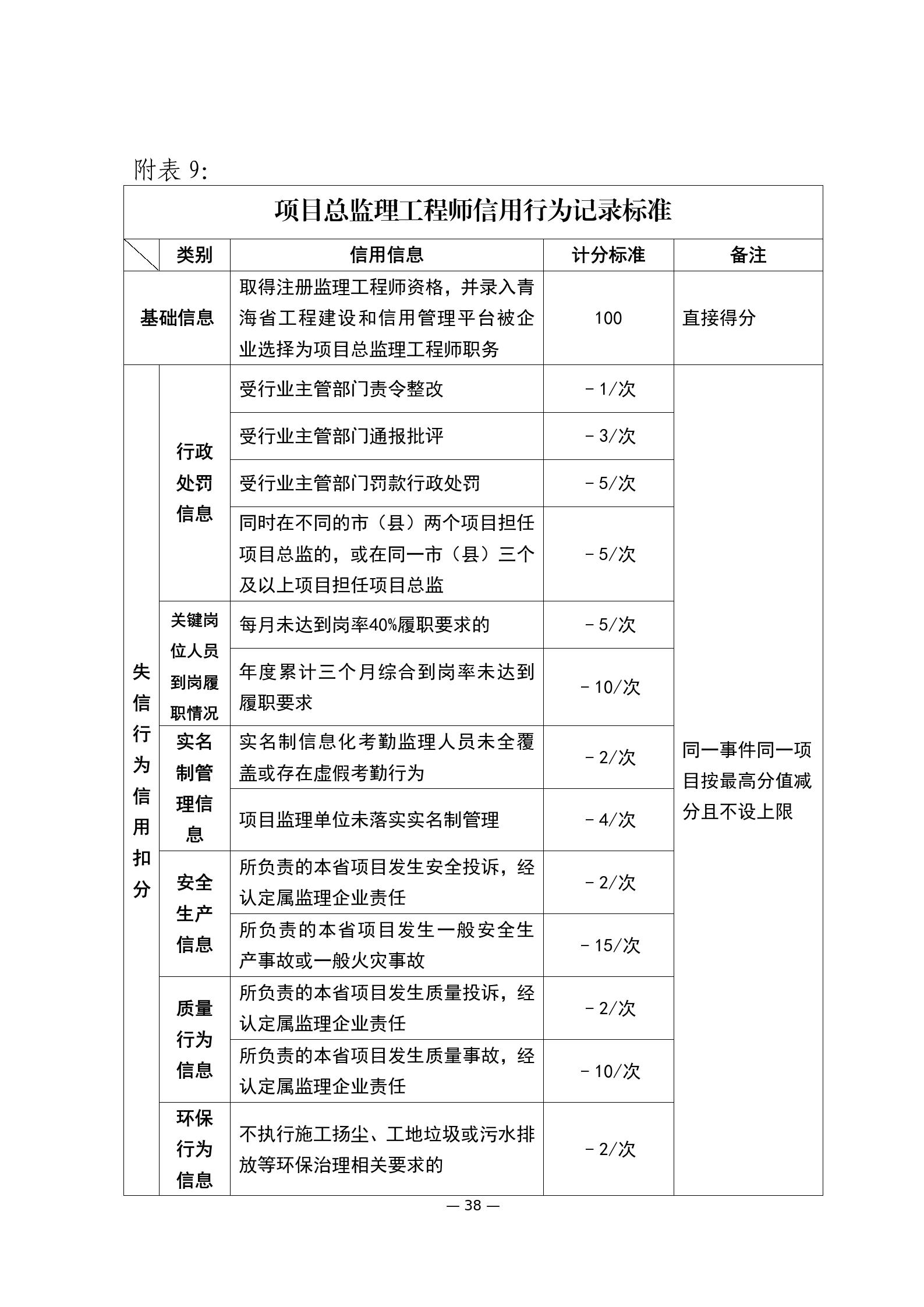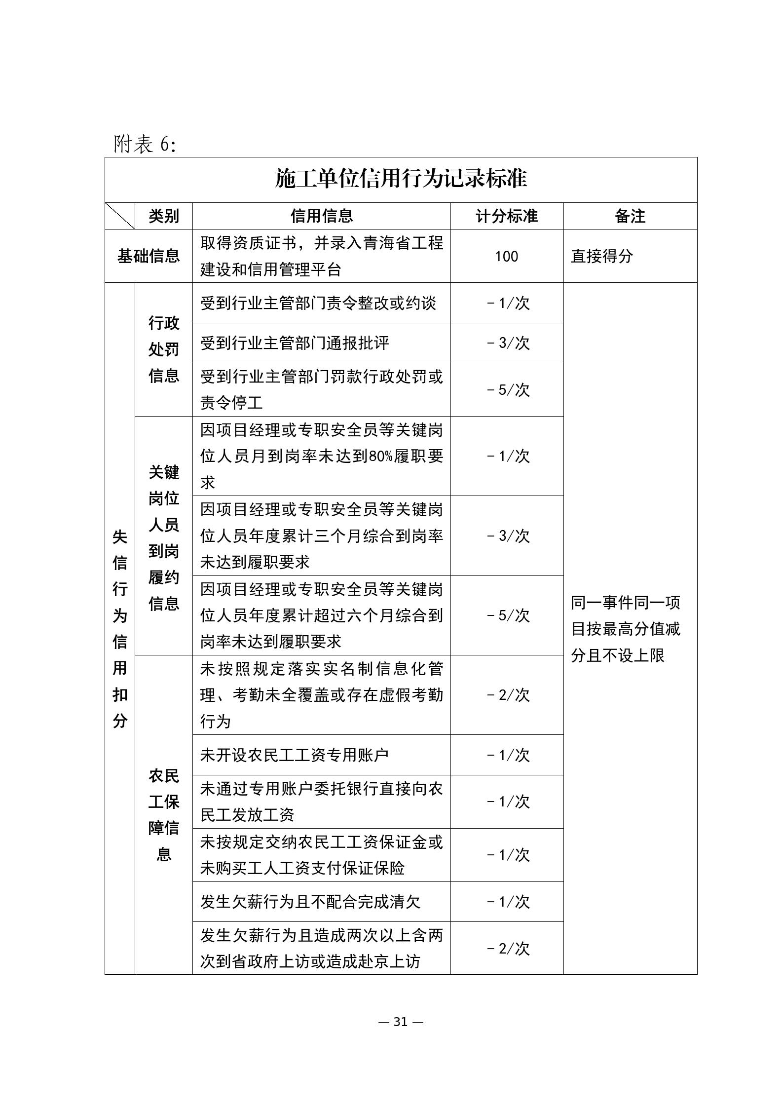 第十六條 建筑市場各方主體和從業(yè)人員的信用評價實行信用記錄、守信獎勵和失信行為動態(tài)記錄記分制。根據(jù)《青海省建筑市場各方主體和從業(yè)人員失信行為記分標(biāo)準(zhǔn)》(附件)進(jìn)行公開展示和記分?;A(chǔ)分100分。