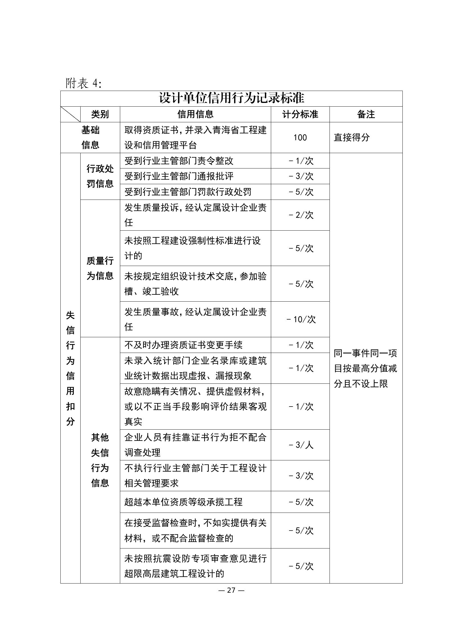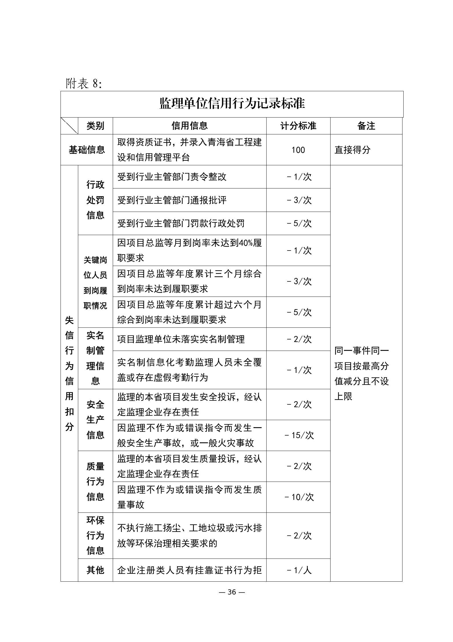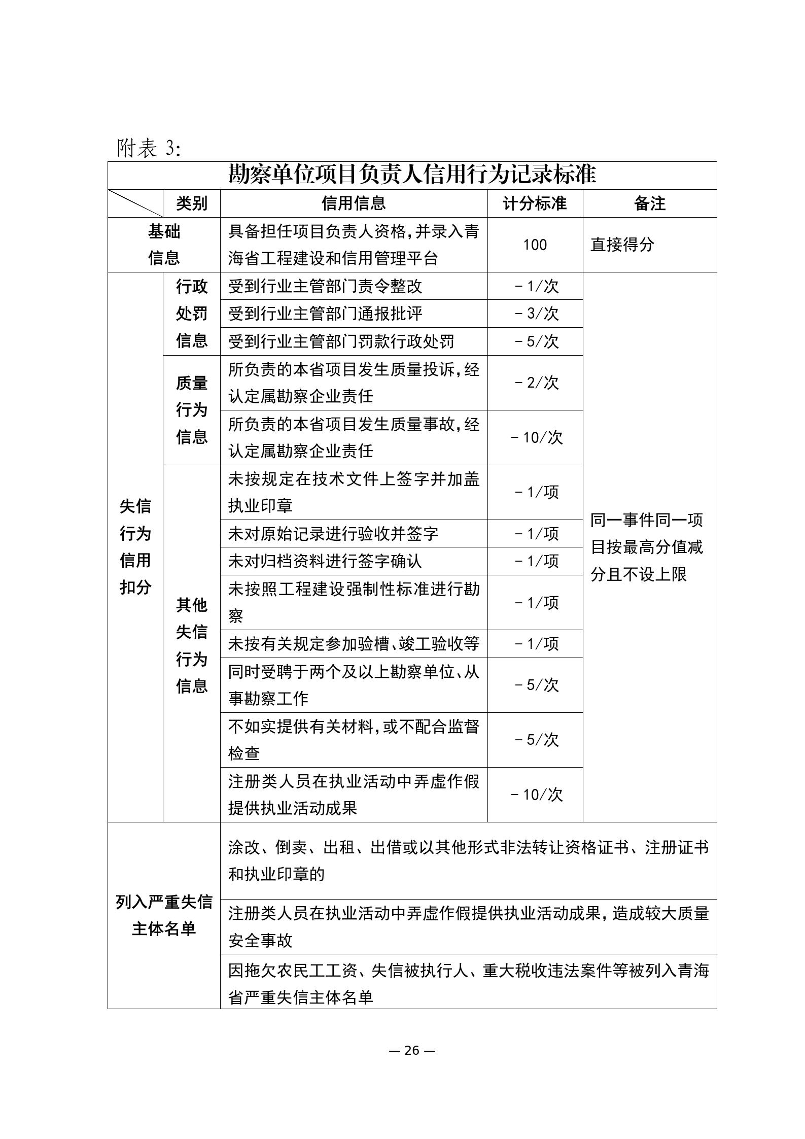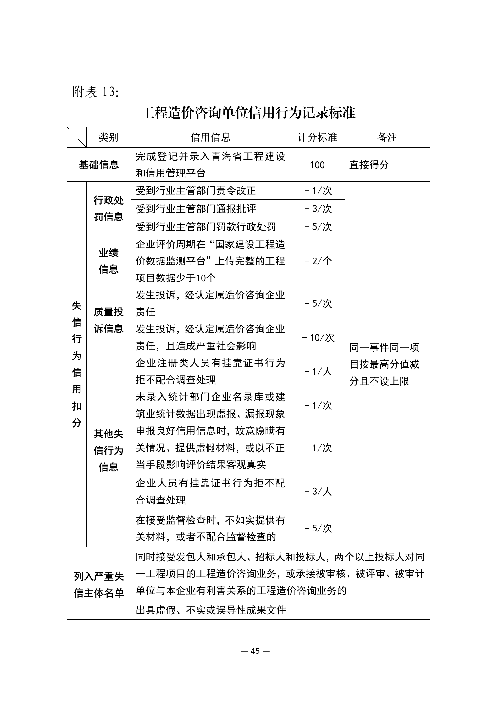 第十六條 建筑市場各方主體和從業(yè)人員的信用評價實行信用記錄、守信獎勵和失信行為動態(tài)記錄記分制。根據(jù)《青海省建筑市場各方主體和從業(yè)人員失信行為記分標(biāo)準(zhǔn)》(附件)進(jìn)行公開展示和記分?;A(chǔ)分100分。