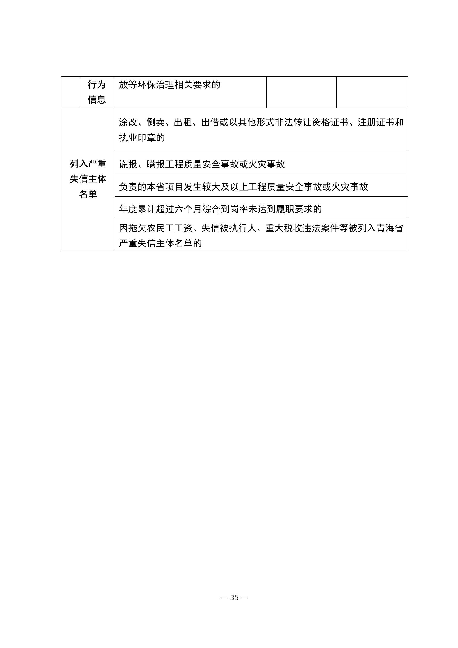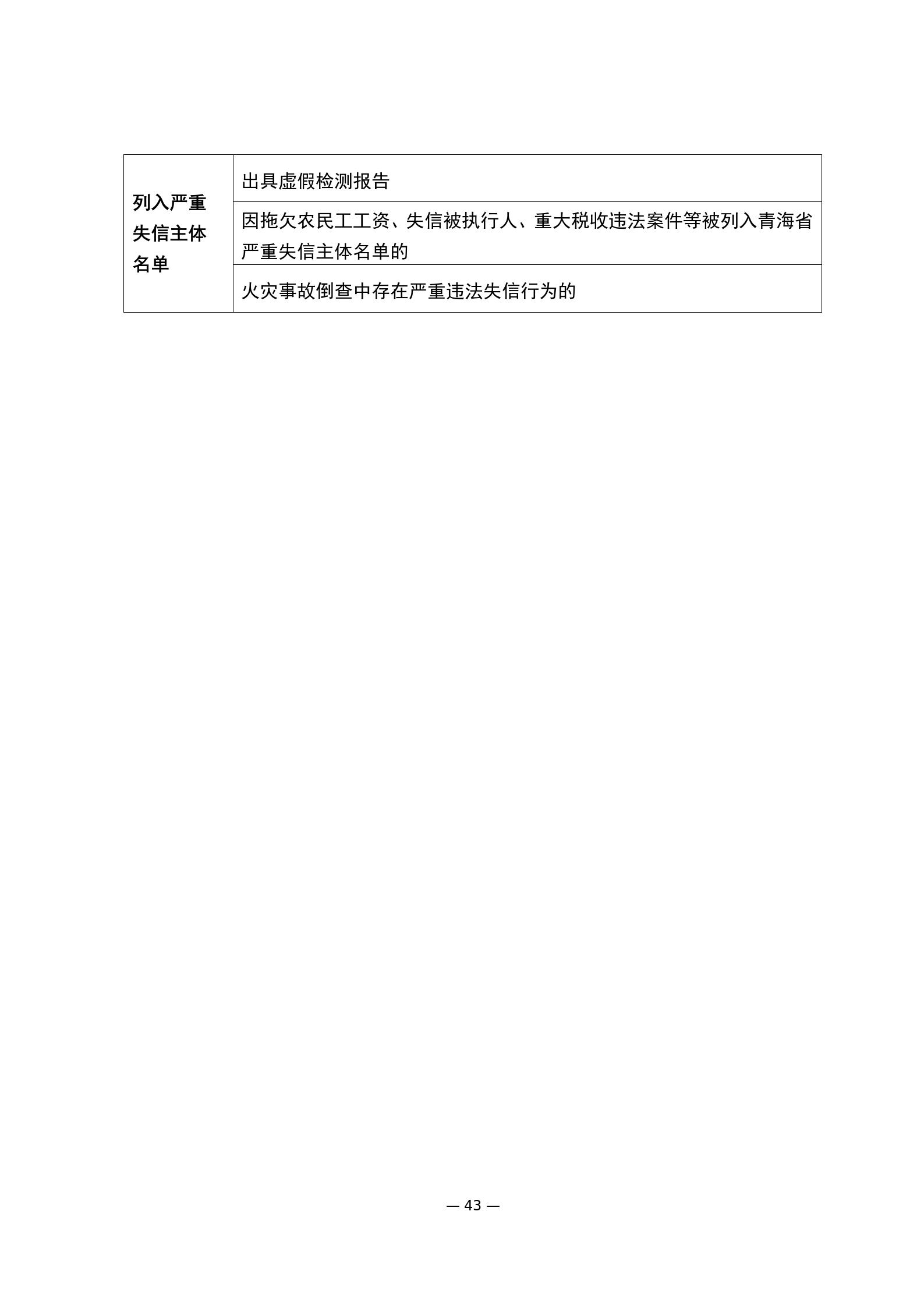 (一)在非國有投資項目中,建設(shè)單位不應(yīng)選用建筑市場主體嚴(yán)重失信主體名單的企業(yè)和從業(yè)人員參與工程建設(shè)活動;24個月內(nèi)取消其參與政府投資項目工程建設(shè)活動資格;省外進(jìn)青企業(yè)24個月內(nèi)不受理進(jìn)青登記業(yè)務(wù);