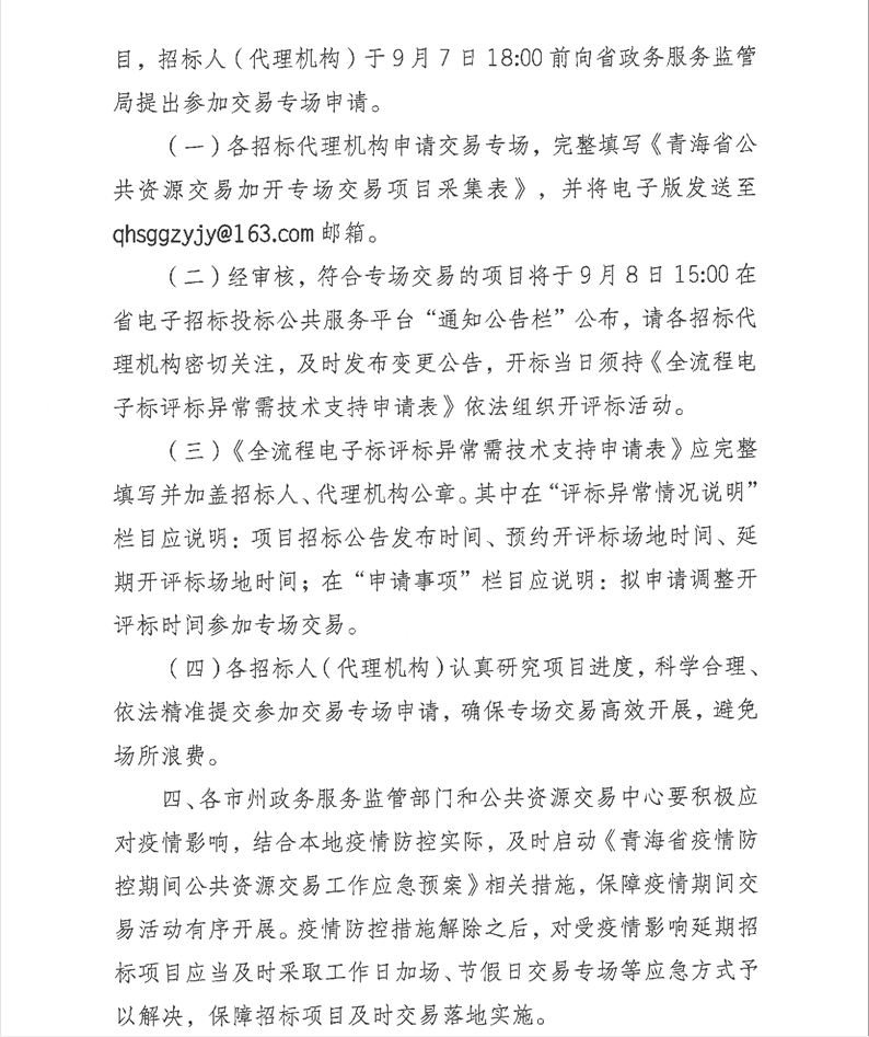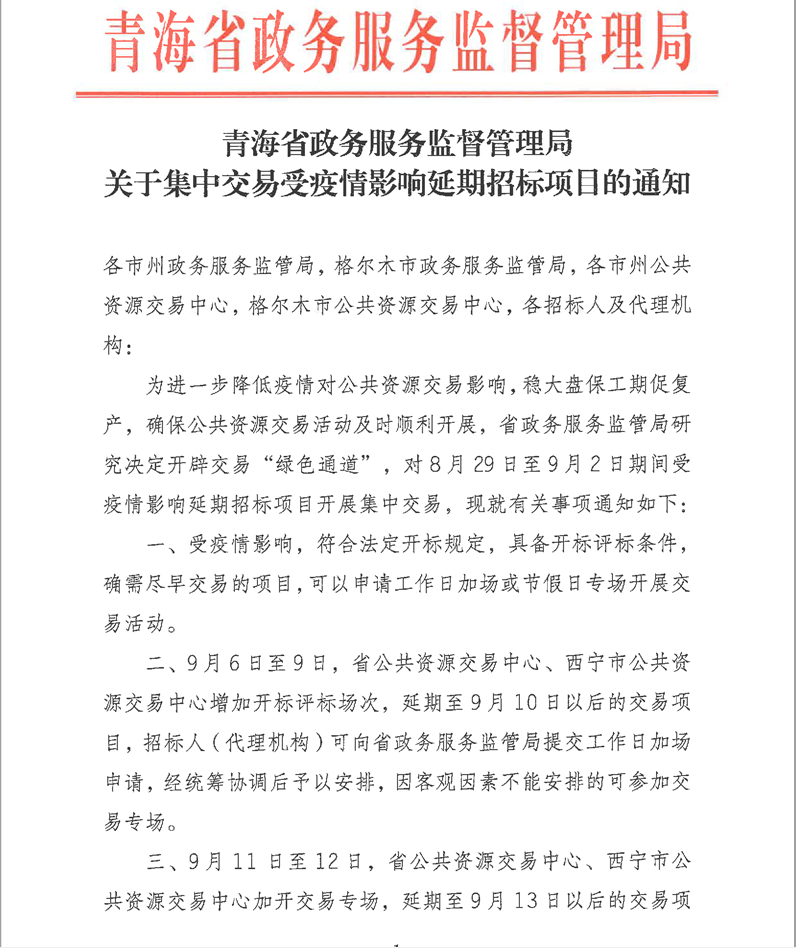 青海省政務(wù)服務(wù)監(jiān)督管理局關(guān)于集中交易受疫情影響延期招標(biāo)項目的通知